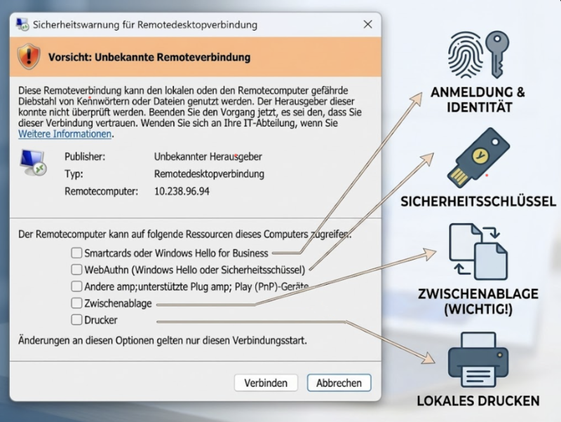 Das System möchte nun explizit von Ihnen wissen, welche lokalen Ressourcen (wie Drucker oder Dateien) Sie für den Remote-Server freigeben möchten.
